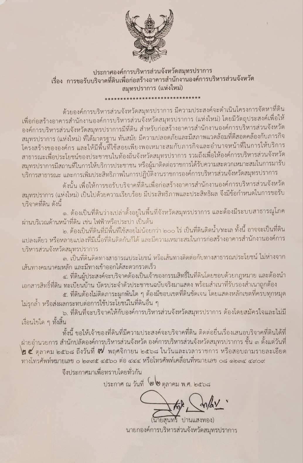 ประกาศองค์การบริหารส่วนจังหวัดสมุทรปราการเรื่อง การขอรับบริจาคที่ดินเพื่อก่อสร้างอาคารสำนักงานองค์การบริหารส่วนจังหวัดสมุทรปราการ (แห่งใหม่)