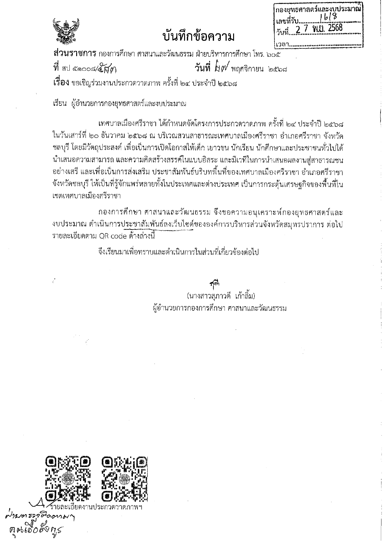 เทศบาลเมืองศรีราชาได้กำหนดจัดโครงการประกวดวาดภาพครั้งที่ 24 ประจำปีพ.ศ.2568