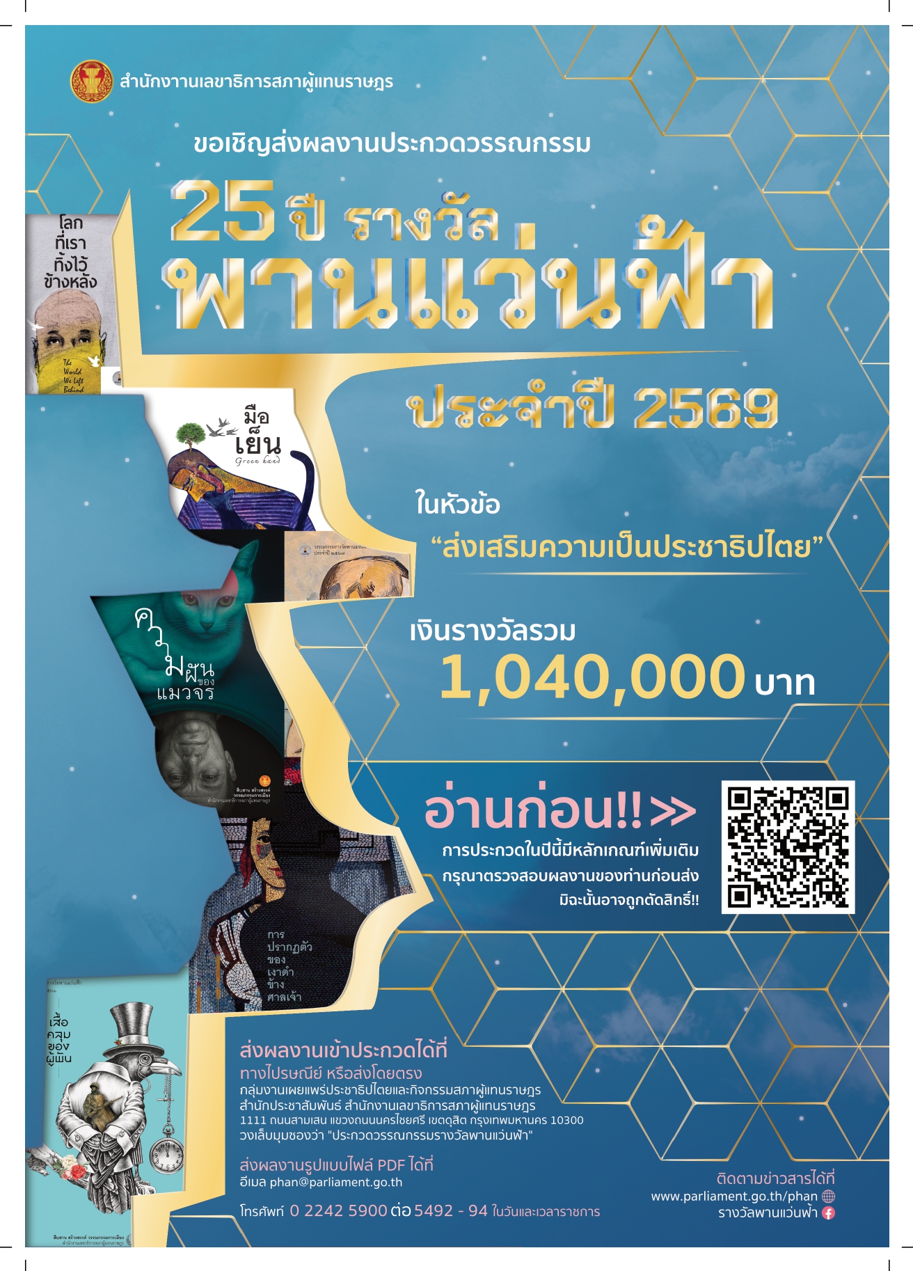 การประกวดวรรณกรรมรางวัลพานแว่นฟ้า ประจำปี 2569Published on Wednesday, 11 February 2026 07:18 | Written by wachiraporn | | Print | | Email | Hits: 40 Commentsการประกวดวรรณกรรมรางวัลพานแว่นฟ้า ประจำปี 2569