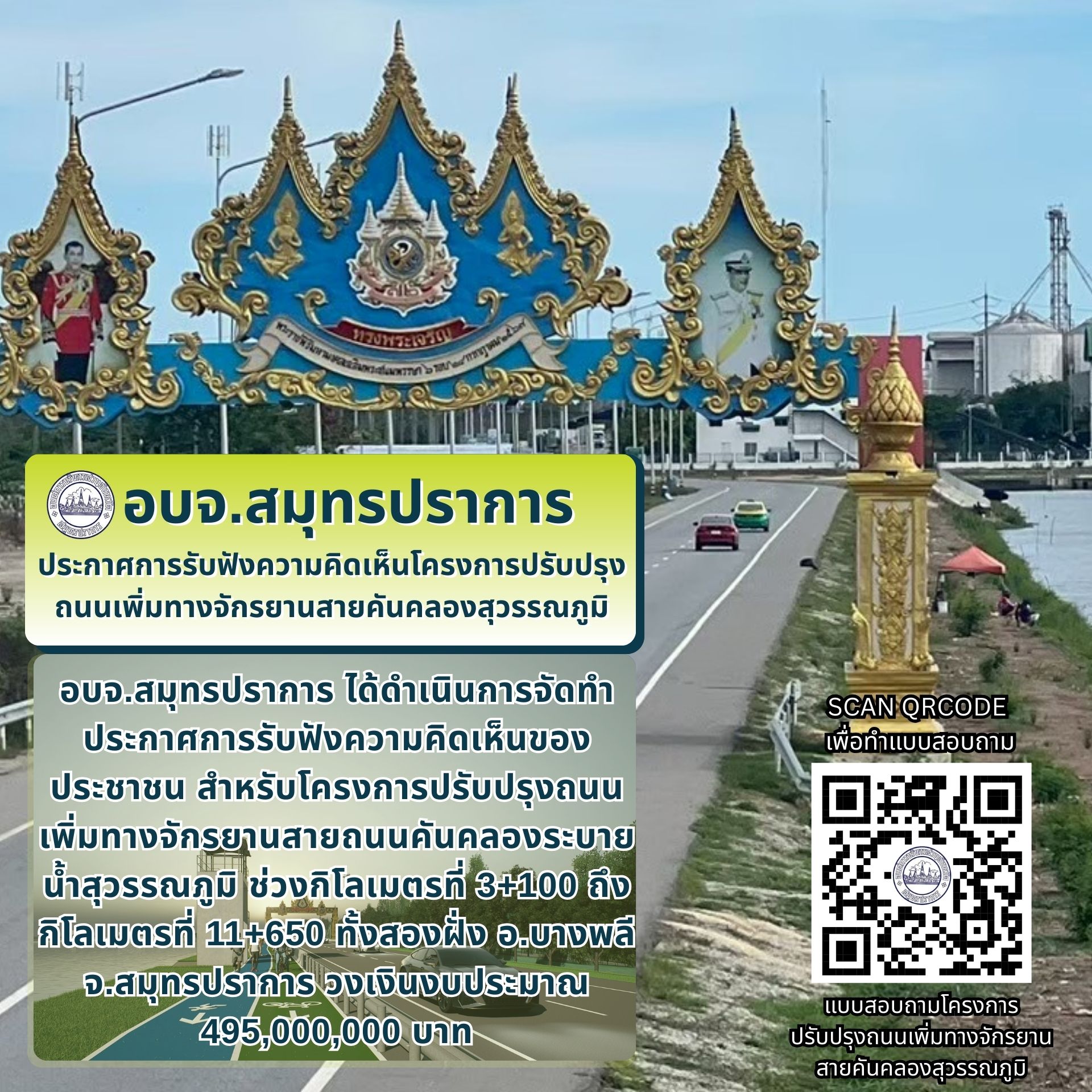 องค์การบริหารส่วนจังหวัดสมุทรปราการ ขอเชิญประชาชนร่วมแสดงความคิดเห็นต่อโครงการปรับปรุงถนนเพิ่มทางจักรยานสายถนนคันคลองระบายน้ำสุวรรณภูมิ ช่วงกิโลเมตรที่ 3+100 ถึงกิโลเมตรที่ 11+650 ทั้งสองฝั่งคลอง ตำบลบางปู อำเภอเมืองสมุทรปราการ เชื่อมการสัญจรไปยังตำบลบางโ