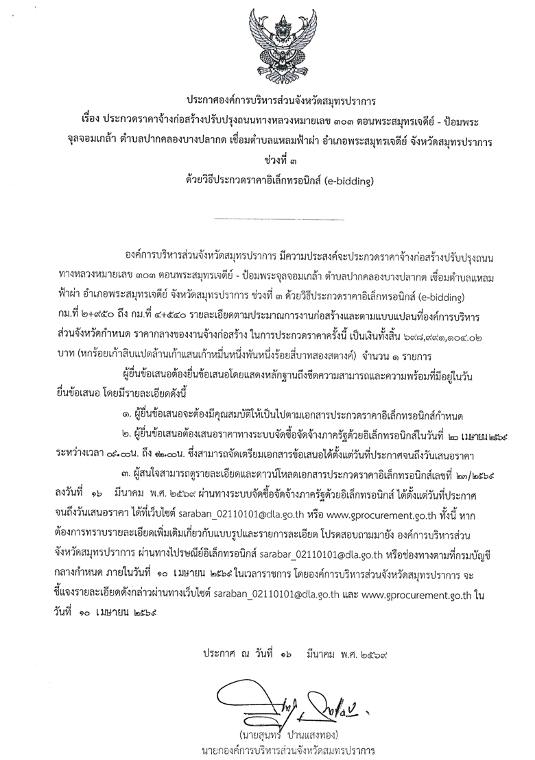 ประชาสัมพันธ์ประกาศองค์การบริหารส่วนจังหวัดสมุทรปราการ โครงการก่อสร้างปรับปรุงถนนทางหลวงหมายเลข303 ตอนพระสมุทรเจดีย์ - ป้อมพระจุลจอมเกล้า ต.ปากคลองบางปลากด เชื่อมต.แหลมฟ้าผ่า อ.พระสมุทรเจดีย์ จ.สมุทรปราการ ช่วงที่3 ด้วยวิธีประกวดราคาอิเล็กทรอนิกส์