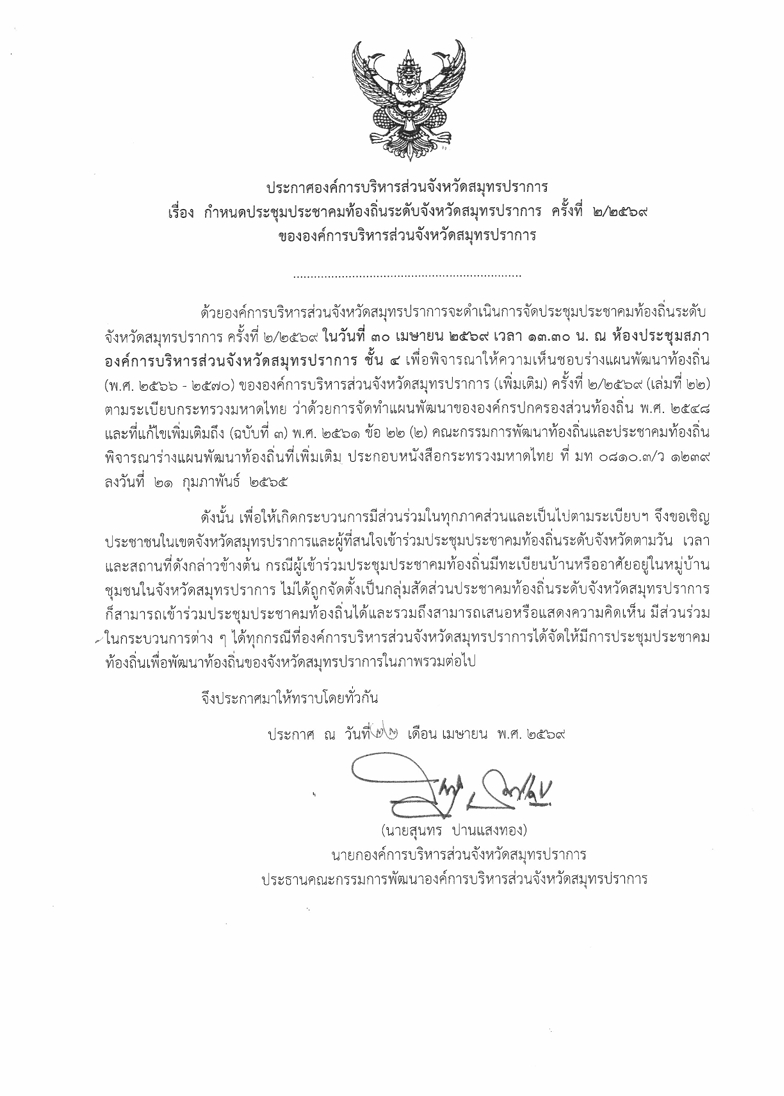 ในวันที่ 30 เมษายน 2569 เวลา 13.30 น. ณ ห้องประุมสภาองค์การบริหารส่วนจังหวัดสมุทรปราการ