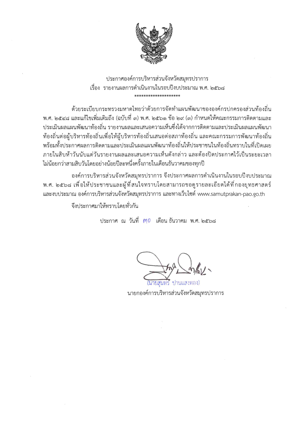 ประกาศองค์การบริหารส่วนจังหวัดสมุทรปราการ เรื่อง รายงานผลการดำเนินงานในรอบปี งบประมาณ พ.ศ. 2568Published on Tuesday, 30 December 2025 08:45 | Written by wachiraporn | | | Hits: 210 Commentsประกาศองค์การบริหารส่วนจังหวัดสมุทรปราการ เรื่อง รายงานผลการดำเนินงานในรอบปีงบประมาณ พ.ศ. 2568 < PrevNext >