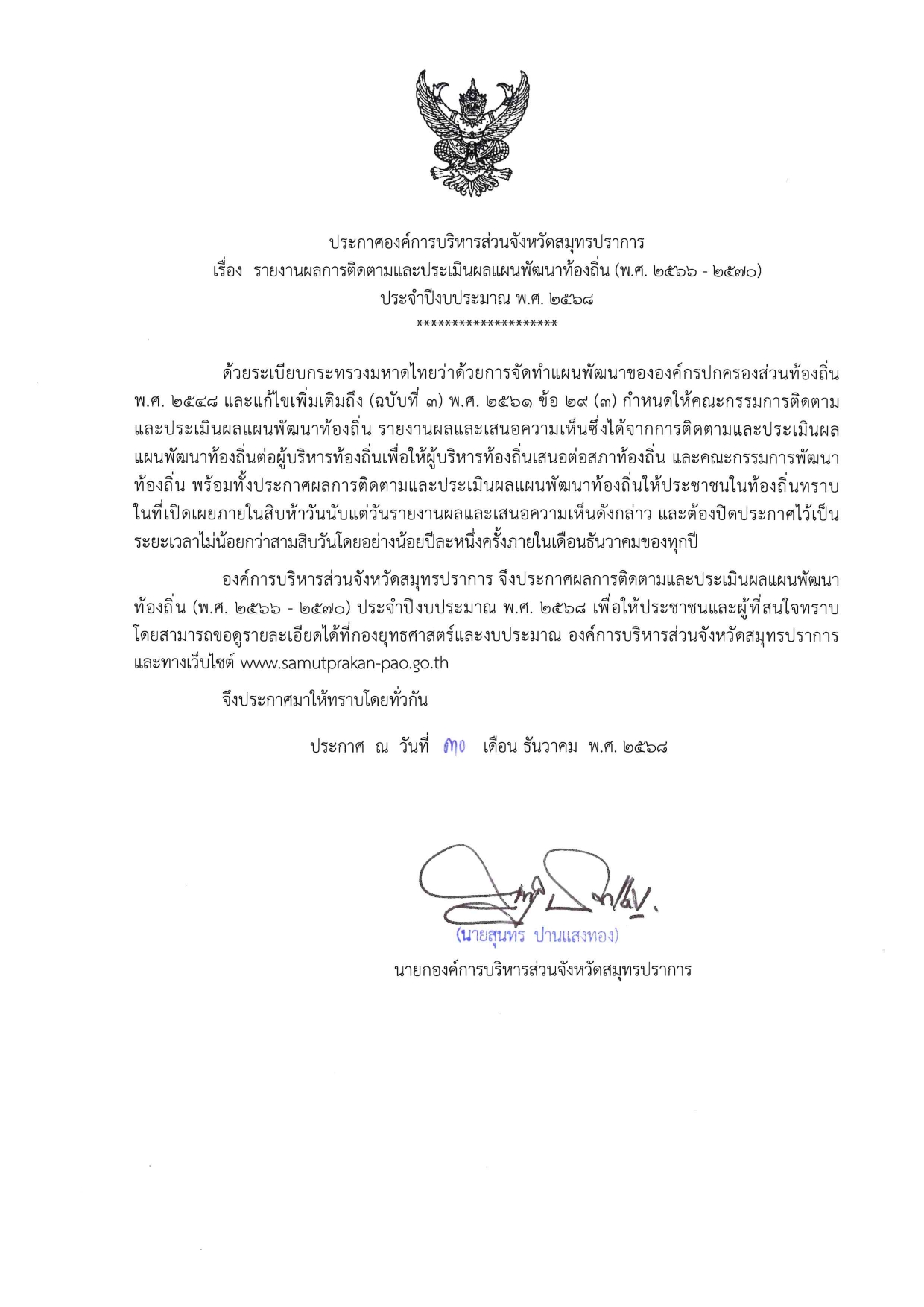ประกาศองค์การบริหารส่วนจังหวัดสมุทรปราการ เรื่อง รายงานผลการติดตามและประเมินผลแผนพัฒนาท้องถิ่น (พ.ศ.2566 -2570) ประจำปีงบประมาณ พ.ศ. 2568Published on Tuesday, 30 December 2025 08:53 | Written by wachiraporn | | | Hits: 200 Commentsประกาศองค์การบริหารส่วนจังหวัดสมุทรปราการ เรื่อง รายงานผลการติดตามและประเมินผลแผนพัฒนาท้องถิ่น (พ.ศ.2566 -2570) ประจำปีงบประมาณ พ.ศ. 2568 < PrevNext >
