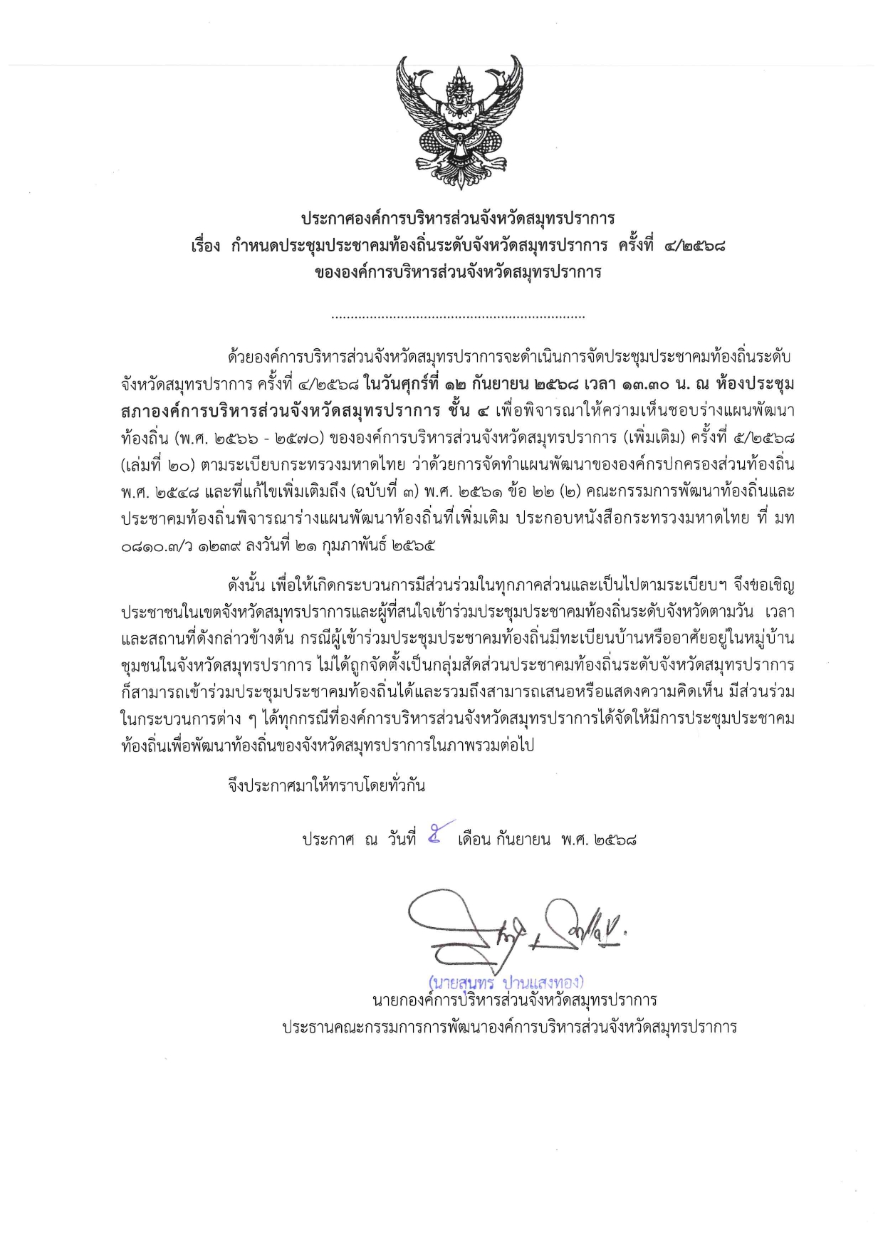 ประกาศองค์การบริหารส่วนจังหวัดสมุทรปราการกำหนดประชุมประชาคมท้องถิ่นระดับจังหวัดสมุทรปราการครั้งที่4/2568