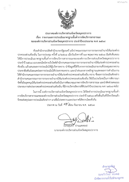 ประกาศ รายงานผลการประเมินมาตรฐานขั้นต่ำการจัดบริการสาธารณะขององค์การบริหารส่วนจังหวัดสมุทรปราการPublished on Tuesday, 30 September 2025 01:37 | Written by supanna | | Print | | Email | Hits: 140 Comments
