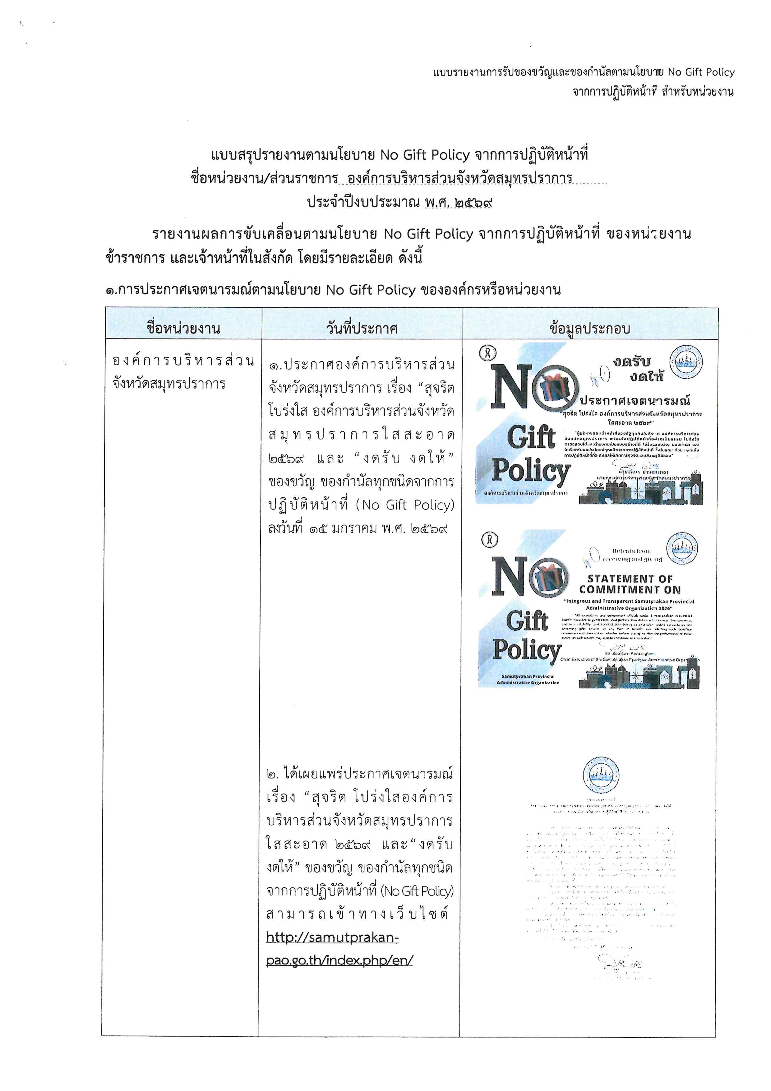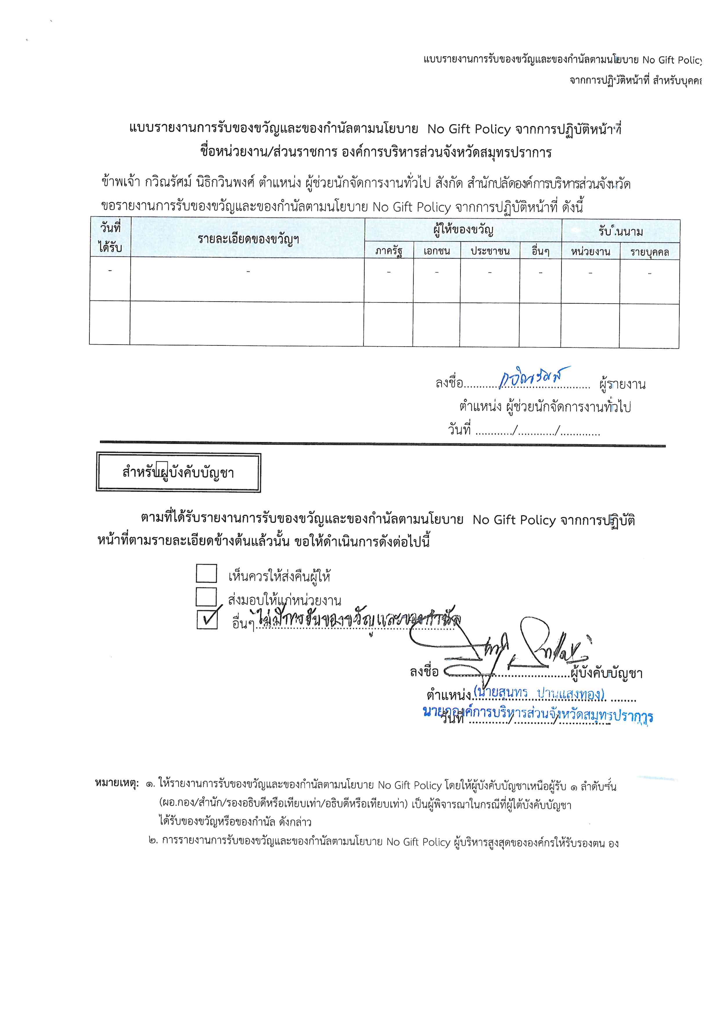 แบบรายงานการรับของขวัญและของกำนัล ตามนโยบาย ( No Gift Policy) จากการปฏิบัติหน้าที่