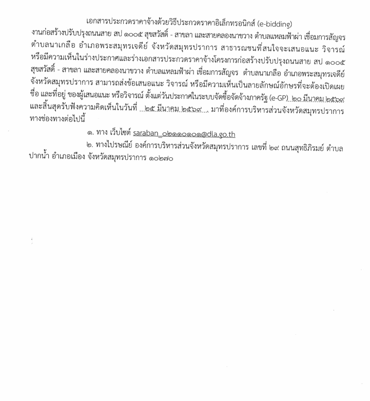 ประกาศรับฟังความคิดเห็นร่างประกาศและร่างเอกสารประกวดราคาจ้างโครงการก่อสร้างปรับปรุงถรรสาย สป 1005 สุขสวัสดิ์-สาขลา และ สายคลองนาขวาง ต.แหลฟ้าผ่า เชื่อมการสัญจร ต.นาเกลือ อ.พระสมุทรเจดีย์ จ.สมุทรปราการ ด้วยการประกวดราคาอิเล็กทรอนิกส์(E-bidding)
