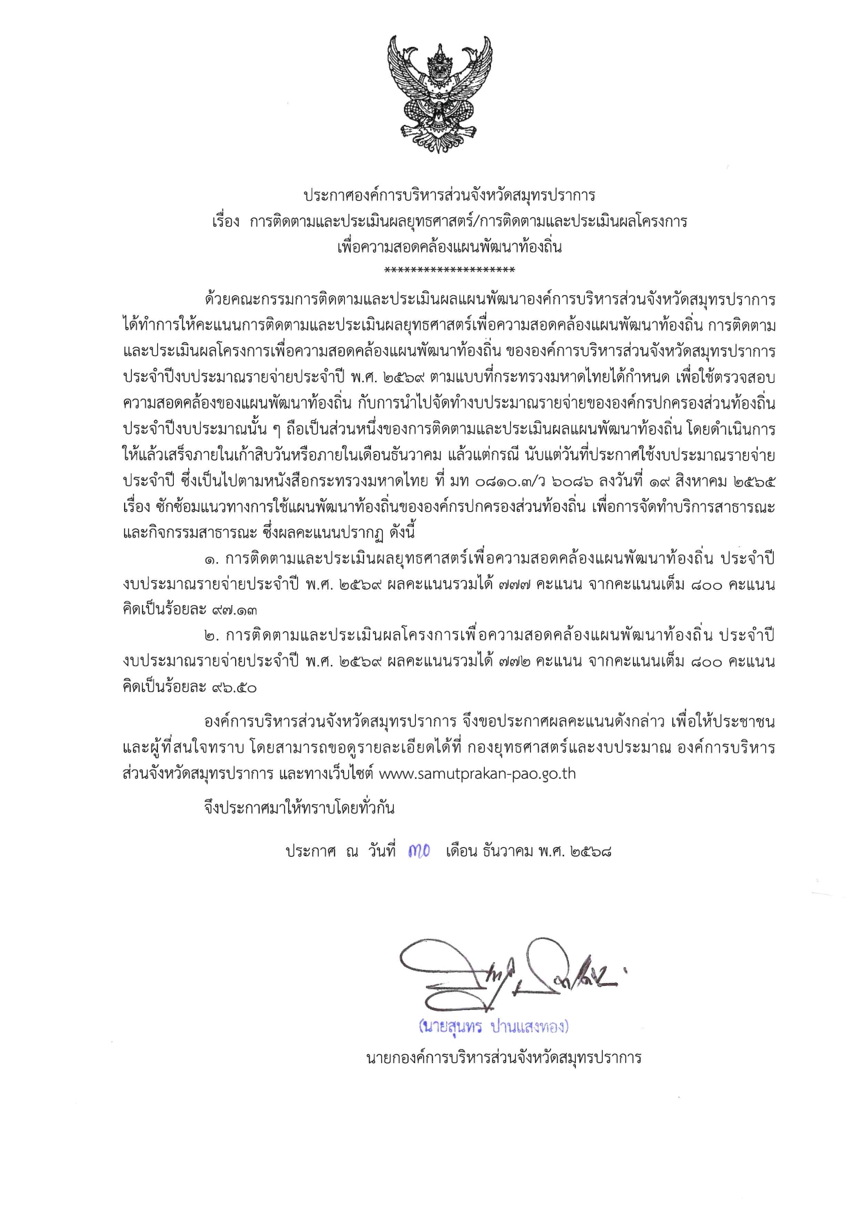 ประกาศองค์การบริหารส่วนจังหวัดสมุทรปราการ เรื่อง การติดตามและประเมินผลยุทธศาสตร์/การติดตามและประเมินผลโครงการ เพื่อความสอดคล้องแผนพัฒนาท้องถิ่นPublished on Tuesday, 30 December 2025 08:59 | Written by wachiraporn | | | Hits: 290 Commentsประกาศองค์การบริหารส่วนจังหวัดสมุทรปราการ เรื่อง การติดตามและประเมินผลยุทธศาสตร์/การติดตามและประเมินผลโครงการ เพื่อความสอดคล้องแผนพัฒนาท้องถิ่น < PrevNext >